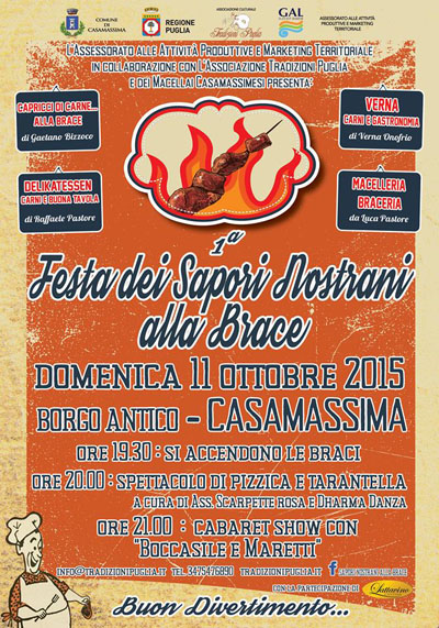 L'Assessorato alle Attività Produttive e Marketing Territoriale in collaborazione con l'Associazione Tradizioni Puglia e dei Macellai Casamassimesi presentano la 1^ edizione della Festa dei Sapori Nostrani alla Brace a Casamassima.