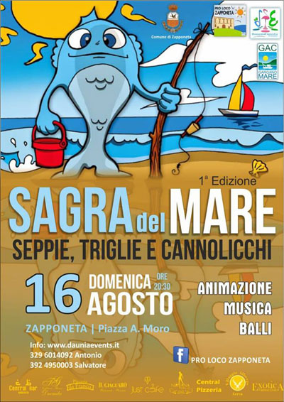 La Pro Loco Zapponeta con il patrocinio del comune è lieta di presentarvi la 1^ edizione della Sagra del Mare, la festa delle Seppie, delle Triglie e dei Cannolicchi a Zapponeta.