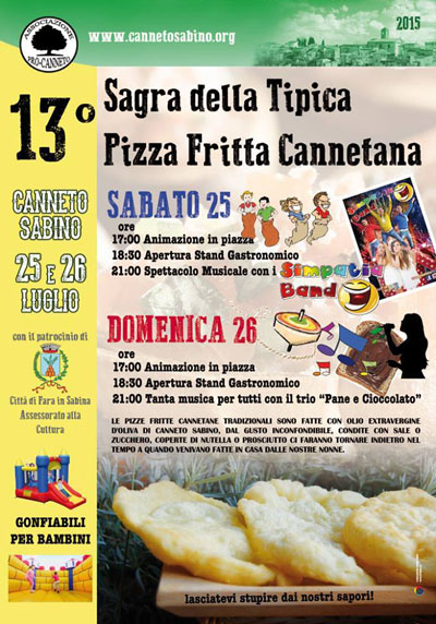 L'Associazione Pro Canneto è lieta di presentare la 13^ edizione della Sagra della Tipica Pizza Fritta Cannetana a Canneto Sabino.