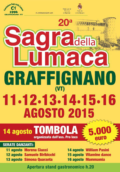 L'Associazione Sagra della Lumaca in collaborazione con la Pro Loco e con il patrocinio del comune di Graffignano presentano la 20^ edizione della Sagra della Lumaca a Graffignano.