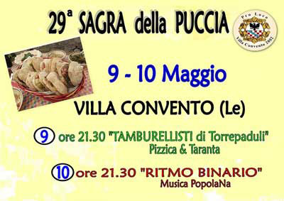 La Pro Loco Villa Convento con il patrocinio del Comune di Lecce è lieta di presentare la 29^ edizione della Sagra della Puccia, a Villa Convento, piccola frazione del Comune di Lecce.