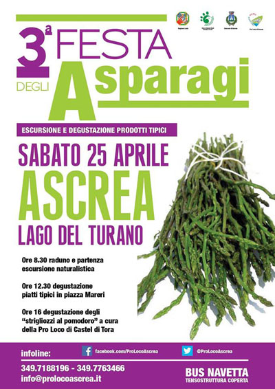 La Pro Loco e il comune di Ascrea sono lieti di presentare la 3^ edizione della Festa degli Asparagi, l'escursione e la degustazione di prodotti tipici ad Ascrea.