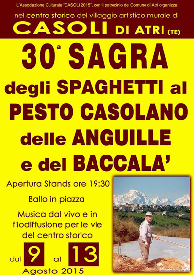 L'Associazione Culturale Casoli 2015 con il patrocinio del comune di Atri è lieta di presentare la 30^ edizione della Sagra degli Spaghetti al Pesto Casolano delle Anguille e del Baccalà a Casoli.