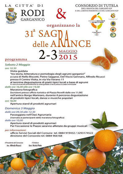 La Città di Rodi Garganico in collaborazione con il Consorzio di Tutela dell'Arancia del Gargano IGP e del Limone Femminello del Gargano IGP presentano la 31^ edizione della Sagra delle Arance a Rodi Garganico.