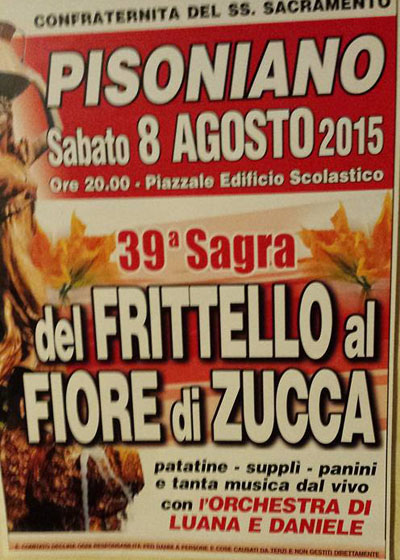 La Confraternita del S.S. Sacramento di Pisoniano è lieta di invitarvi alla 39^ edizione della Sagra del Frittello al Fiore di Zucca a Pisoniano.