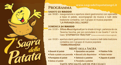L'Associazione NOMOS Onlus anche quest'anno rinnova l'appuntamento con la Sagra della Patata, che valorizza uno dei prodotti di punta dell'economia agricola e mira alla sensibilizzazione del territorio dell'Agro.