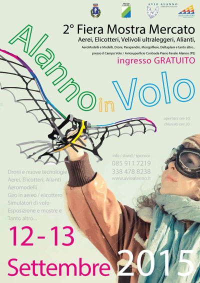 Il Comune di Alanno è lieto di presentare la 1^ Fiera Mostra Mercato di Aerei, Elicotteri, Velivoli ultraleggeri, Aero Modelli e Modelli, Droni, Aquiloni, Alianti, Parapendii, Deltaplani, Mongolfiere del Centro Italia dal nome Alanno in Volo.