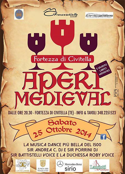 Dopo il grande successo di Sabato 4 Ottobre a Teramo, torna l'AperiStreet in stile medievale, nello spettacolare scenario della Fortezza di Civitella del Tronto (Teramo), ambientato con personaggi e costumi del 1500.