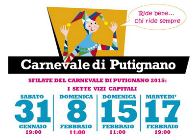 - Ore 10.00 - 13.00 / 17.00 - 21.00 - Chiostro Biblioteca Comunale “Sartisticamente” Mostra di artigianato sartoriale carnascialesco a cura del comune di Putignano e Assessorato alla Cultura e Turismo”