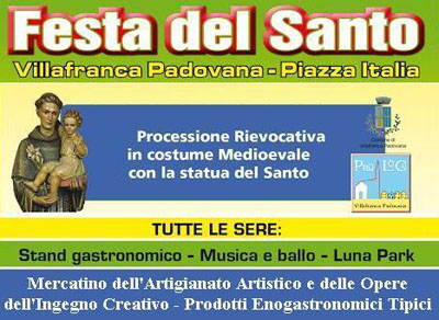 La Pro Loco di Villafranca Padovana, l'Amministrazione Comunale, in collaborazione con il Consorzio delle Pro Loco del Cittadellese, la Protezione Civile e l'Associazione Culturale NSV Organizzazione Eventi affiliata A.I.C.S. - Comitato Provinciale di Rovigo è lieta di organizzare la Festa del Santo.