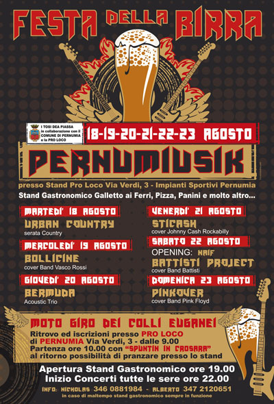 La Pro Loco con il Patrocinio del comune di Pernumia è lieto di presentare Pernumiusik, la Festa della Birra a Pernumia.