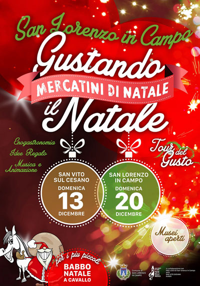 L'amministrazione comunale, in collaborazione con Pro Loco, Avis, San Vito Giovani e Auser è lieta di presentare la seconda edizione di Gustando il Natale, i tradizionali mercatini di Natale a San Lorenzo in Campo e San Vito, nel cuore della Valcesano.