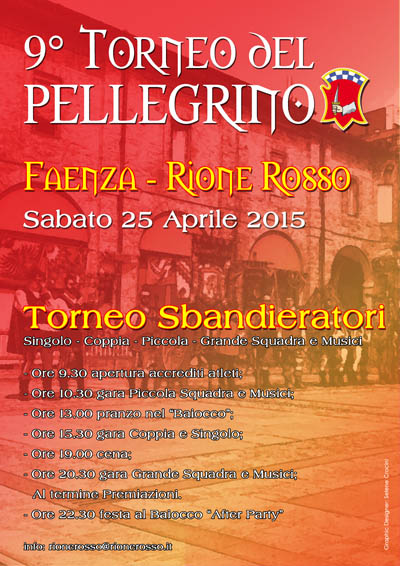 Il Torneo Sbandieratori si svolgerà nell'arco della giornata di Sabato 25 aprile 2015, in P.za Rampi, nell'area adiacente alla sede del Rione Rosso, in Via Campidori 28 a Faenza.