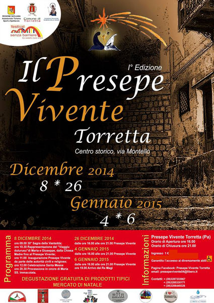 L'Organizzazione Presepe Vivente di Torretta (PA) vi invita a partecipare alla 1° edizione de "Il Presepe Vivente a Torretta" che avrà inizio l'8 dicembre 2014, in Via Montello e in concomitanza con la "Sagra della Vastedda" giunta alla sua trentesima dizione.