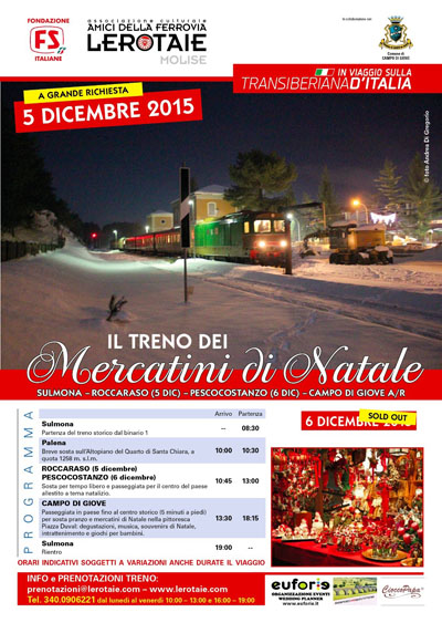 L'Associazione Culturale Amici della Ferrovia Le Rotaie con il patrocinio del comune di Campo di Giove è lieta di presentare Il Treno dei Mercatini di Natale a Sulmona.