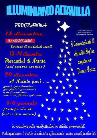 I commercianti di Altavilla Irpina con il patrocinio del Comune di Altavilla Irpina presentano "Illuminiamo Altavilla", una manifestazione che si terrà nei seguenti giorni:
