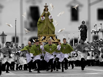 E' all'altezza della fontana monumentale che inizia il tutto: i portatori si fermano, la folla trattiene il respiro, loro prendono il tempo giusto, poi è un attimo: sollevano la statua della Vergine e cominciano a correre in direzione della statua del Cristo.