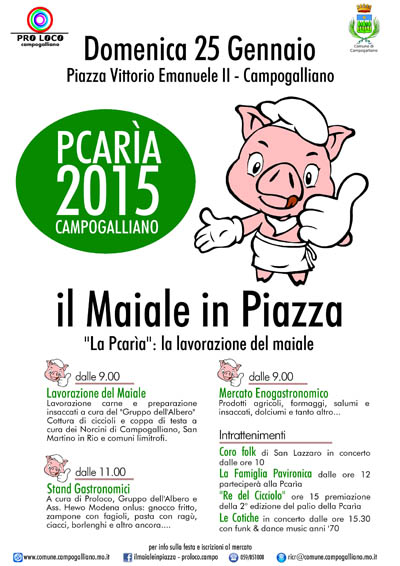 Il Comune e la Proloco di Campogalliano l'XI edizione de "La Pcarìa: il Maiale in Piazza" in Piazza Vittorio Emanuele II, Via Roma e Via Garibaldi.