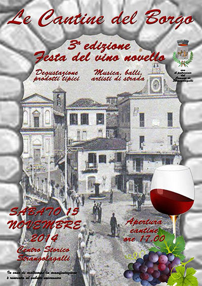 Terza edizione della "Festa del vino novello" a Strangolagalli che si svolgerà il 15 Novembre 2014. Le strade del centro storico si animeranno con balli e musica degli artisti di strada. Sarà possibile inoltre degustare i prodotti tipici.