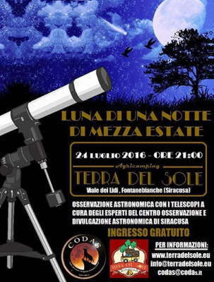 L'Agricampeggio Terra del sole di Fontane Bianche organizza, per il prossimo 24 luglio in collaborazione con il Codas, il Centro Osservazione e divulgazione astronomica di Siracusa, una serata all'insegna dell'osservazione della Luna e dei pianeti, immersi nella natura e lontani dalle luci cittadine. L'evento sarà un'occasione per proporre osservazioni al telescopio e per approfondire i temi legati al nostro satellite naturale. Vieni a trovarci alle ore 20:30 per trascorrere una serata imperdibile durante la quale gli amici del Codas metteranno a diposizione strumenti astronomici e la propria competenza per permettere a tutti i curiosi di vedere le meraviglie del cielo stellato ed apprendere i segreti di quella meravigliosa scienza che è l'astronomia.