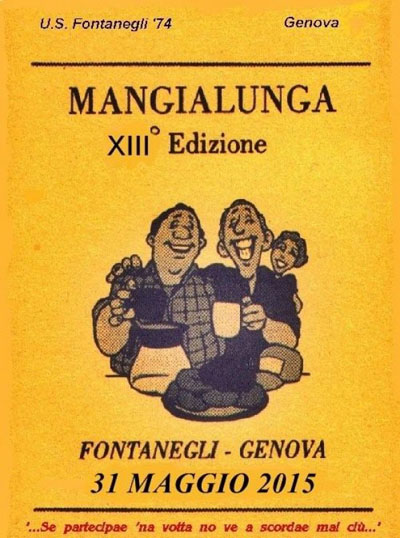 Domenica 31 Maggio 2015, Fontanegli invita ed accoglie con entusiasmo i partecipanti alla XIII Edizione della "Mangialunga", circa 5 km di percorso enogastronomico, lungo i suggestivi rioni rurali della delegazione Genovese. Si gusteranno prelibatezze liguri, dall’aperitivo al dolce con il seguente itinerario: