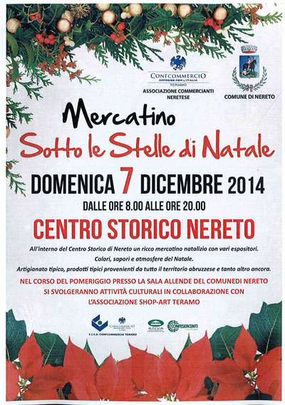 Il centro storico neretese sarà teatro di un ricco mercatino natalizio, con numerosi espositori. Artigianato tipico, prodotti tipici provenienti da tutto il territorio abruzzese e tanto altro ancora.