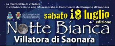 La Parrocchia di Villatora di Saonara in collaborazione con l'Assessorato al Commercio del Comune di Saonara (PD) e l'Associazione Culturale NSV Organizzazione Eventi affiliata A.I.C.S. - Comitato Provinciale di Rovigo, organizzano la 4^ edizione della Notte Bianca.