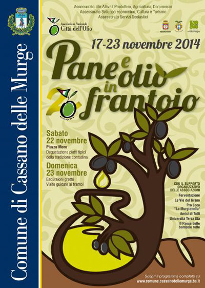 Tanti spazi dedicati all’agricoltura, all’artigianato locale, scene di vita contadina, danze e musica popolare allieteranno una serata dedicata alle cose sane e buone. Domenica 23 si svolgeranno le escursioni lungo i paesaggi olivetati delle campagne cassanesi, le visite guidate in frantoio e le escursioni lungo il “Circuito delle Grotte”.