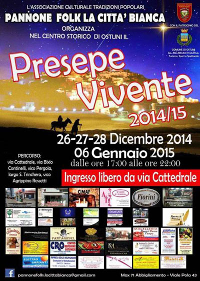 L'Associazione Culturale Tradizioni Popolari 'Pannone folk La Città Bianca' con il patrocinio del Comune di Ostuni presenta la I edizione del "Presepe Vivente" nel centro storico di Ostuni.