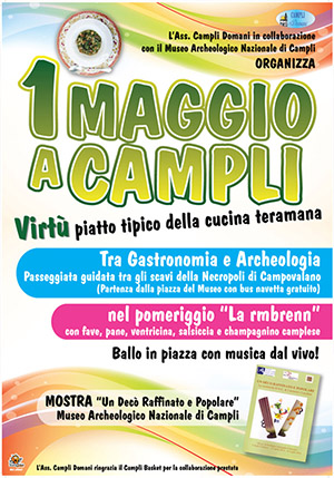 L'Associazione Campli Domani in collaborazione con il Museo Archeologico Nazionale di Campli (TE) organizza per il 1 maggio 2014 un evento tutto da assaporare e visitare. Tra gastronomia e archeologia; passeggiata guidata tra scavi della Necropoli di Campovalano e "la rmbreen" con fave, pane, ventricina, salsiccia e champagnino camplese.