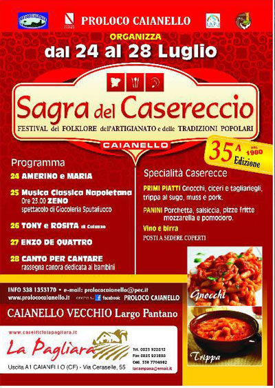 La Pro Loco di Caianello è lieta di presentare la 35^ edizione della Sagra del Casereccio, il festival del Folclore, dell'artigianato e delle tradizioni popolari.