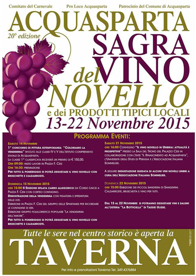 Il Comitato del Carnevale e la Pro Loco di Acquasparta sono lieti di presentare la 20^ edizione della Sagra del Vino Novello e dei Prodotti Tipici Locali ad Acquasparta.