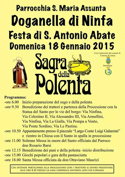 La Parrocchia Santa Maria Assunta con il patrocinio del Comune di Cisterna Latina e Sermoneta presenta "La Sagra della Polenta", in occasione della Festa di Sant'Antonio Abate.