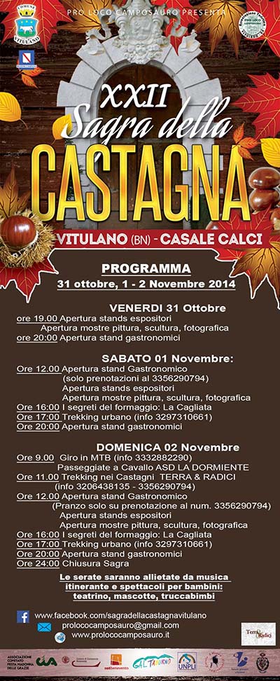 Anche quest'anno si rinnova l'appuntamento con la Sagra della Castagna a Vitulano giunta alla sua XXII edizione. La manifestazione si terrà dal 31 oOtobre al 2 Novembre 2014.