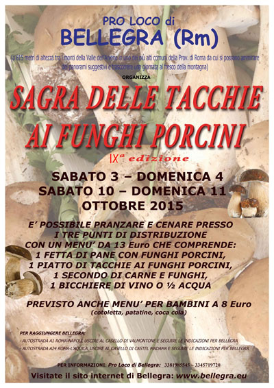 La Pro Loco di Bellegra è lieta di presentare la 9^ edizione della Sagra delle Tacchie ai Funghi Porcini a Bellegra.