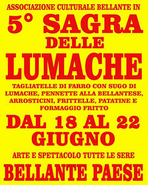 Grazie all'impegno di tutti i membri dell'associazione ''Bellante In'' e alla disponibilità delle signore del Paese, questa sagra offre l'occasione di degustare un piatto raramente disponibile nei ristoranti: il sugo di lumache accompagnato alle Tagliatelle di Farro e le Pennette alla Bellantese (piatto tipico della zona con piselli, funghi e carne macinata).
