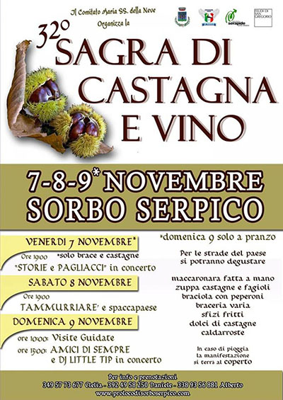 Il 7, 8 e 9 Novembre a Sorbo Serpico torna la rinomata manifestazione "Sagra di castagna e vino", giunta all trentaduesima edizione.