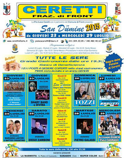 L'evento avrà luogo da giovedì 23 a mercoledì 29 luglio 2015 a Ceretti, piccola frazione del Comune di Front, dalle 19.30 alle 23.30.