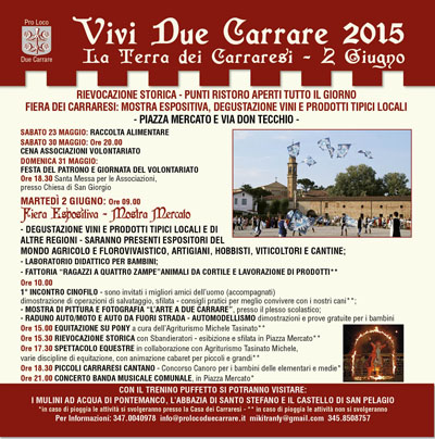 La Pro Loco di Due Carrare in collaborazione con l'Associazione Culturale NSV Organizzazione Eventi affiliata A.I.C.S. - Comitato Provinciale di Rovigo, organizzano la manifestazione “Vivi Due Carrare 2015”.
