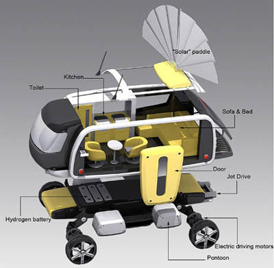 I lati positivi di questo veicolo sono numerosi. In primo luogo occorre sottolineare la potenza del mezzo, fornito di un motore a idrogeno. Il veicolo è anche dotato di un ventaglio sul tetto, che può essere utilizzato sia per ricevere l'energia da sole che come vela per consentire la navigazione.