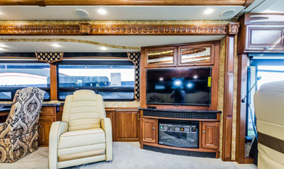 Continuando sulla strada del lusso, il motorhome è rivestito al suo interno con piastrelle di porcellana. Inoltre, è dotato di un grande lucernario con diverse gradazioni di ombra, di arredamenti in legno lavorato e di diversi pannelli attraverso cui è possibile controllare tutte le funzioni interne ed esterne del mezzo.